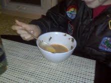 Me: Stop the slurping! Outward, outward! The spoon is always moving outward. That's right. Now gently tip the contents into your mouth -- do not put the entire spoon in your mouth. That's why it's large and that's why it's called a soup spoon.